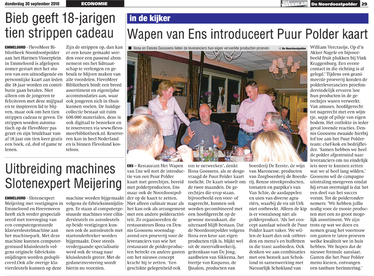 * Dennis is op zondag 26 september 2010 als eerste studiogast op bezoek geweest bij radio Noordoostpolder. Marian Besseling presenteert één keer per vier weken ‘Nieuwsnet Dorpen’ met nieuws uit Ens en Kraggenburg. Het live interview stond geheel in het teken van Puur Polder, tien minuten vrije publiciteit en daarmee ook de eerste officiële bekendmaking van Puur Polder aan onze potentiële gasten!